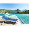 Спинка шезлонга имеет 5 позиций угла наклона. Допустимая нагрузка – до 150 кг. Вставка сделана из полиэфирных нитей с покрытием из ПВХ в виде сетки (сетку можно изменять). Сетка Serge Ferrari.