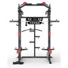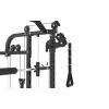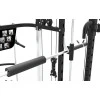 Машина Смита: гриф длиной 1743 мм с системой фиксации на 16 уровнях высоты (455 – 1805 мм). Диаметр держателя весовых дисков подходит для весовых дисков ø 50 мм и ø 25 мм, что позволяет гибко регулировать нагрузку. Используются линейные подшипники скольжения. Для безопасного выполнения жима, приседаний и тяг без напарника используется две системы безопасности с крючком, что предотвращает падение штанги.