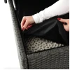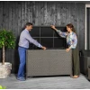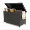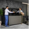 Ящик для хранения Varise предназначен для интенсивного использования на открытом воздухе. Его стальной каркас с толстостенными профилями обеспечивает чрезвычайную стойкость. Оплетка из техноротанга не боится дождя, солнца и пыли. Крышка выдерживает нагрузку до 220 кг, поэтому может использоваться и в качестве дополнительного сиденья. Встроенные газовые амортизаторы обеспечивают мягкое открывание/закрывание, а внутренний защитный воротник и армированная пластина не пропустят влагу внутрь даже во время дождя. Высокие ножки 11см позволяют воздуху циркулировать под дном, а пластиковая армированная панель снизу обеспечивает дополнительную водостойкость и защиту от сырости. Все продумано до мелочей!