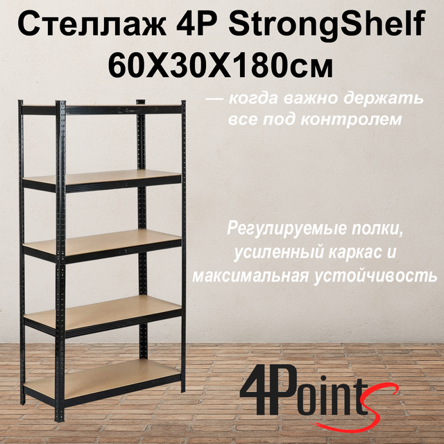 Описание Стеллаж 4Р StrongShelf 180X60X30см черный 5 полок МДФ общая нагрузка до 750 кг для склада кладовой гараж
