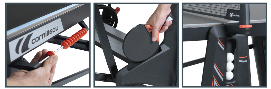 КАРМАННЫЕ ДЛЯ АКСЕССУАРОВ : Функциональные карманы, расположенные с обеих сторон стола, позволяют хранить четыре ракетки и четыре мяча. Это решение гарантирует быстрый доступ к необходимым аксессуарам без лишних поисков и помогает поддерживать порядок.