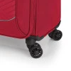 Чемодан оснащен четырьмя сдвоенными полноповоротными колесами с возможностью независимого разворота каждого колеса на 360°. Системой предусмотрено равномерное перераспределение нагрузки на каждое колесо, что в свою очередь способствует плавному движению и маневренности чемодана, прилагая при этом минимум усилий. Колеса изготовлены из высокотемпературного термопластического полиуретана (TPU). Материал имеет прочность сравнимую с пластиком, гибкостью силикона, а также обладает повышенной стойкостью к перепадам температур. Отличительной особенностью колес из TPU материала является снижение шума до минимума при движении чемодана по неровной поверхности. Благодаря стойкости к истиранию материал колес отличается длительным сроком эксплуатации.