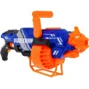 Игрушечное ружье оснащено барабанным типом зарядки, а большой магазин вмещает до 20 шаров. Для стрельбы нужно прицелиться и, удерживая кнопку питания, нажать на спусковой крючок. Если снаряд заклинило, его можно безопасно вынуть, отодвинув дверь в сторону.