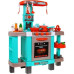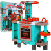 Мини-кухня в светлых тонах состоит из столешницы с плитой и сушилкой для посуды. По бокам дополнительная полочка и раковина с краном. Внизу набора находится манекен духовки с открывающейся дверцей и полочками разной формы, куда можно спрятать игрушечную пищу. У маленьких поваров есть кастрюли, кухонная утварь, столовая посуда, а также поддельные овощи и другие продукты.