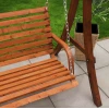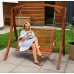 Гойдалка Grino виготовлена з масиву модрини, відомої своєю довговічністю та природною стійкістю до погодних умов. Додаткове просочення захищає деревину від вологи, зберігаючи її структуру і природну красу на довгі роки. Сидіння підвішене на оцинкованих ланцюгах, що забезпечують плавне гойдання та захищені від корозії. Міцна дерев'яна конструкція і широка стійка основа гарантують безпечне використання навіть за максимального навантаження до 200кг.
