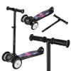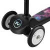 Завдяки великим переднім колесам діаметром 12 см і задньому колесу 10 см, самокат добре справляється як на рівних тротуарах, так і на дещо більш нерівних поверхнях. Міцна конструкція дозволяє максимальне навантаження до 50 кг, що дозволяє дітям користуватися ним протягом декількох років.