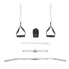 У комплекті — повний набір аксесуарів: дві одинарні ручки D-handle, ручка для щиколотки, ланцюг з карабіном, пряма коротка ручка та довга похила штанга — усе необхідне для різноманітних варіантів хвату та вправ.