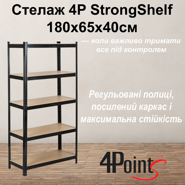 Опис Стелаж 4Р StrongShelf 180х65х40см чорний 5 полиць МДФ загальне навантаження до 875 кг для складу комори гараж