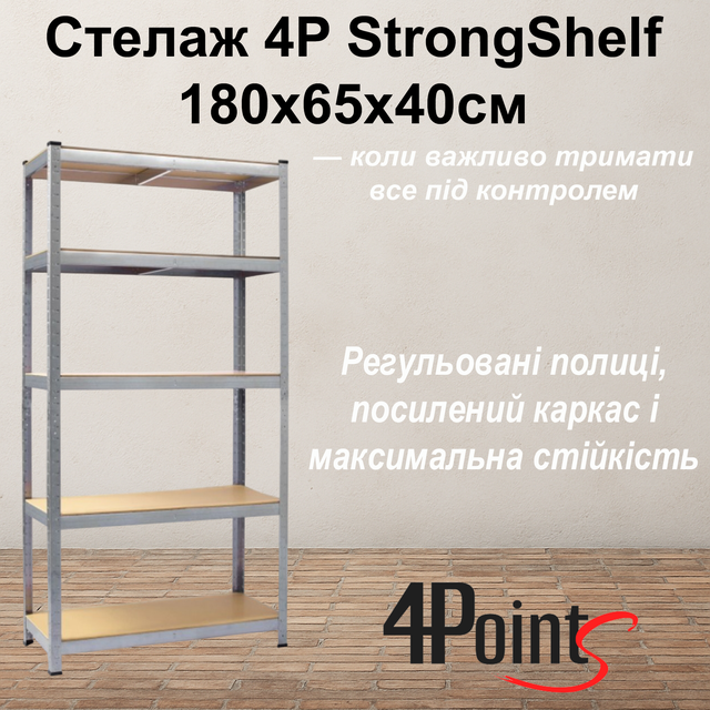 Опис Стелаж 4Р StrongShelf 180х65х40см оцинкований 5 полиць МДФ загальне навантаження до 875 кг для складу комори гараж