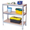 Стелаж металевий для зберігання самих різних речей. Полиці з МДФ витримують до 175 кг рівномірно розподіленого навантаження, що робить полку ідеальною для зберігання, наприклад, банок з консервами, а також в гаражі в якості місця для зберігання інструментів, запасних частин або інших аксесуарів. Може бути встановлений як книжкова шафа або верстак.