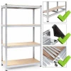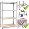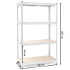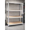 Металевий стелаж розміром 160×80×30 см з 4 полицями підходить для організації зберігання в гаражі, коморі, майстерні, підсобному приміщенні, на складі або в офісі. Каркас виготовлений зі сталі Q195 з оцинкованим покриттям, полиці — з МДФ. Конструкція збирається за системою boltless and clips, без болтів, що спрощує монтаж.
