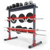 У верхній частині обладнання є полиця для зберігання гантелей. Його витривалість до 150 кг, тому ви можете зберігати на ньому весь комплект обважнювачів одночасно, не боячись пошкодити обладнання. Мінімальний внутрішній розмір гантелі 12 см, максимальний 18 см.